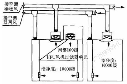 此方式的缺點是設(shè)置循環(huán)風機箱及處理噪聲,需要較大的空間,而通常百級區(qū)周圍風管都比較密集,需要精心布局。此方式百級區(qū)上部靜 壓箱相對百級區(qū)室內(nèi)為正壓,頂棚高效過濾器與吊架間的滲漏,為靜壓箱流向室內(nèi),直接影響百級區(qū)潔凈度。對施工質(zhì)量要求較高。(具 體可參考: