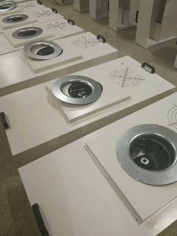 ffu風機過濾器單元也可用于潔凈室末端送風。ffu風機過濾單元產品設有初效過濾器、高效過濾器兩級過濾裝置。風機從頂部將空氣吸入并經初、高效過濾器過濾,過濾后的潔凈空氣在整個出風口送出。安裝方式有懸掛式和落地支架兩種。
