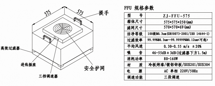 本產品主要介紹我司生產的575*575*320規格的FFU,型號:ZJFFU575,圖文結合更清晰,讓您更好更多的了解我司生產的ZJFFU575產品。